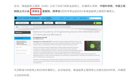 熱烈祝賀徐揚(yáng)生當(dāng)選2021年美國(guó)國(guó)家工程院外籍院士
