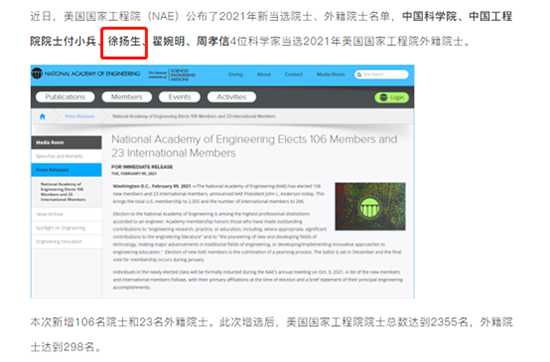 據(jù)悉:當(dāng)?shù)貢r間2月9日,美國國家工程院發(fā)布通知,(NAE)公布2021年新當(dāng)選院士、外籍院士名單,本次 新增106名院士和 23名外籍院士。此次增選后,美國國家工程院院士總數(shù)達(dá)到 2355名,外籍院士達(dá)到 298名。其中,中國科學(xué)院、中國工程院院士徐揚生入選!
