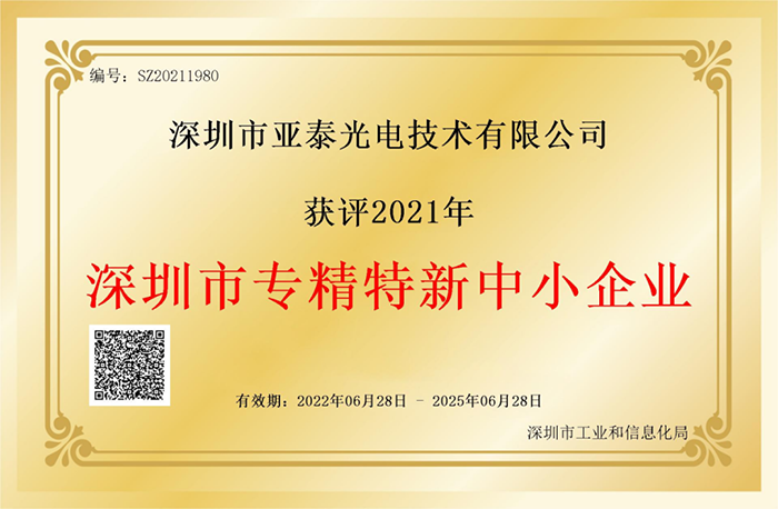 深圳亞泰光電經(jīng)過(guò)五年的披荊斬棘與風(fēng)雨兼程,憑借著行業(yè)的專業(yè)性、管理體系的完善性及強(qiáng)大的研發(fā)創(chuàng)新能力,獲得了2021年度深圳市“專精特新”中小企業(yè)殊榮。